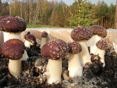 Sobald die Pilzkultur vollständig mit weiß-grauem Pilzmyzel besiedelt ist, kann man das Pilzwachstum von Braunkappen durch Abdecken des Strohballens mit frischer bis unfertiger Komposterde anregen. Die Erdschicht sollte man ca. 3-5cm dick auf den Strohballen geben. Die Mikroorganismen in frischer Komposterde regen die Fruchtkörperbildung an. Es kann deshalb in besonders keimfreier Umgebung vorkommen, dass sich erst Braunkappen bilden, wenn genügend Mikroorganismen auf den Außenseiten der Pilzkultur vorhanden sind. Deshalb geben einige findige Pilzzüchter sogar unfertigen Kompost, Gülle oder Mist auf die Braunkappen Pilzkulturen, um so noch ertragreichere Erntewellen auszulösen.